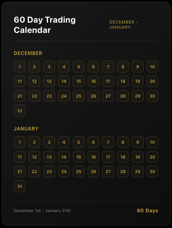 It’s a 60-day live trading sprint from Dec 1 – Jan 31, where I trade alongside you, break down markets daily, call out opportunities, help you structure prop firm accounts, and guide you through swing/position setups.